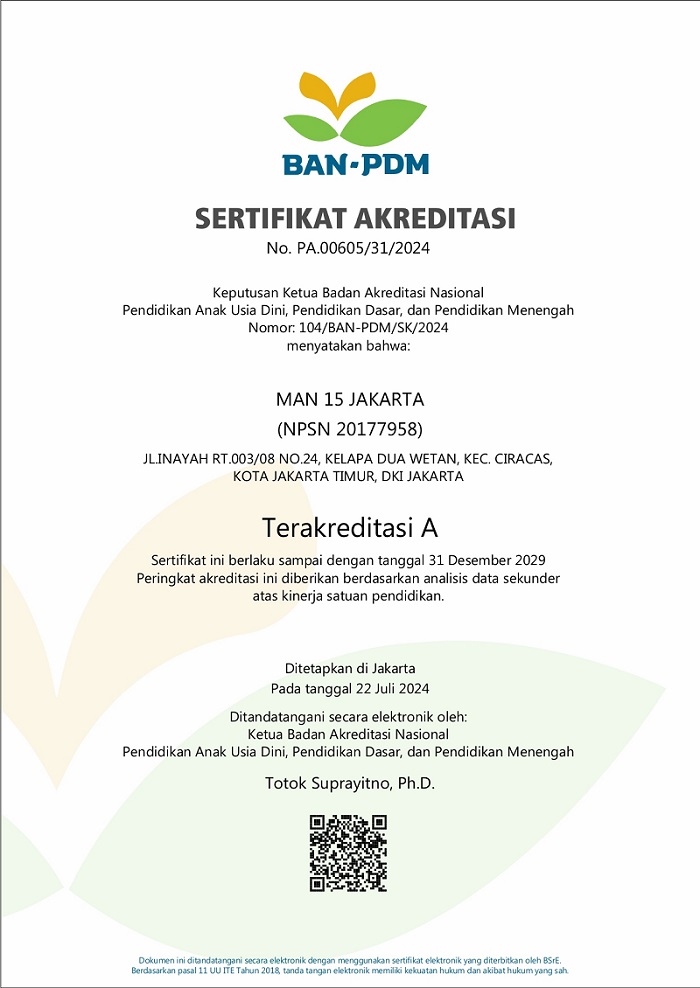 Selamat datang di Website MAN 15 Jakarta, Website ini dimaksudkan sebagai sarana publikasi untuk memberikan Informasi dan gambaran MAN 15 Jakarta dalam Hal Publikasi kepada masyarakat. Melalui keberadaan website ini kiranya masyarakat dapat mengetahui seluruh informasi tentang Kebijakan Pemerintah Kab. Jakarta Timur pengelolaan sektor Pendidikan di wilayah Pemerintahan Kab. Jakarta Timur. Diharapkan website ini bisa dijadikan sebagai salah satu media komunikasi yang efektif, dapat memberikan informasi, layanan yang akurat dan akuntabel untuk membangun pendidikan di Provinsi DKI Jakarta.